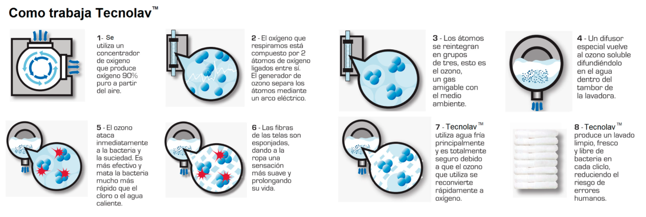 El sistema de ozono Tecnolav® tiene como objetivo reducir al máximo sus gastos en su lavandería, ya que permite realizar procesos de lavado en agua fría, con ahorros de tiempos, reduciendo notablemente los consumos de agua y energía. El menor uso de calderas disminuye las emisiones contaminantes al aire libre, y se reduce el uso de combustibles renovables.